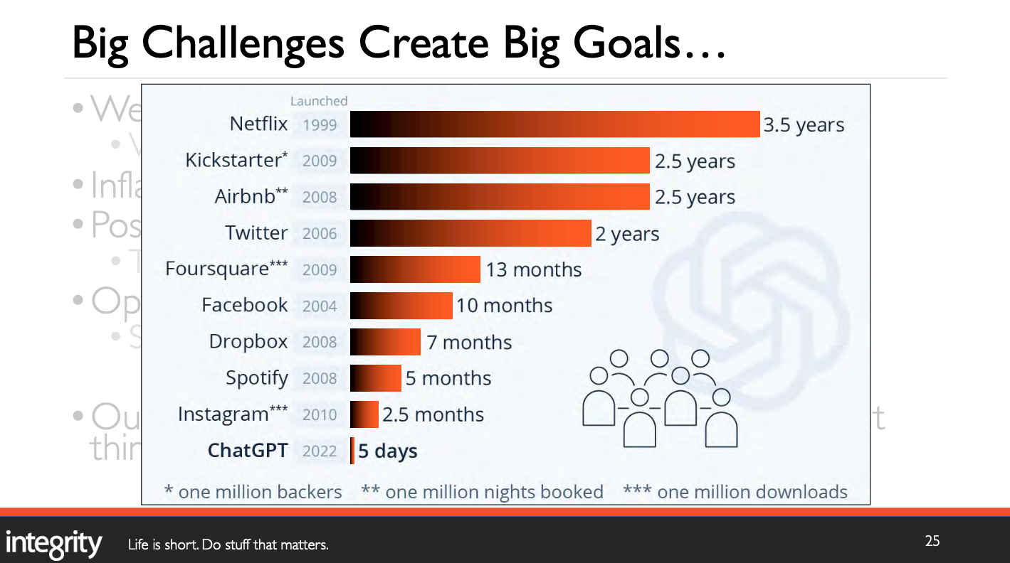 As a company, Integrity thinks of itself as an organism that has to adapt and change through evolution. Integrity recognized that they were not going to be able to adapt and change nimbly in a bureaucratic model which doesn’t allow for rapid response to new technological challenges. Our company deliberately shifted away from a 1900s industrialization model of “predict and control” and instead has adopted a model of “evolve and adapt.” This approach has never been more important for a technology company in human history.