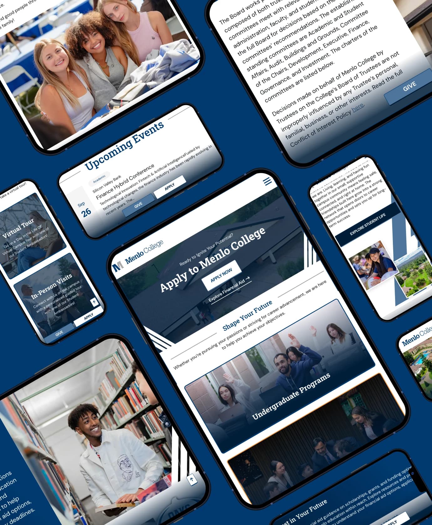 To transform Menlo College’s online presence, the project prioritized mobile-friendly design and a visually engaging experience across all devices. The site architecture and navigation were reimagined for clarity and ease, enabling users to quickly find exactly what they’re looking for. The site was optimized so that the primary user journey catered to prospective students and streamlined the application process in addition creating clear user journeys for current students, parents, alumni, and donors. The design approach for prospective students focused on aesthetics and messaging that resonate with Gen Z, creating a vibrant, modern look that reflects Menlo College’s energy and forward-thinking values.